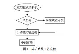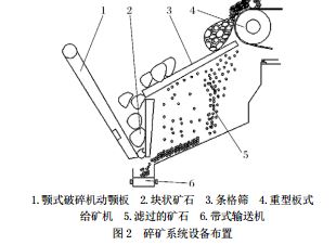 該礦碎礦系統(tǒng)工藝流程如圖1所示,設(shè)備布置如圖2所示,來(lái)料首先通過(guò)條格篩進(jìn)行篩選。