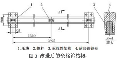 針對(duì)條格篩在生產(chǎn)中存在的問(wèn)題,對(duì)格篩條進(jìn)行了改進(jìn)設(shè)計(jì),改進(jìn)后的條格篩主要由耐磨構(gòu)件和承載骨架構(gòu)件兩大部分組成,如圖3所示。