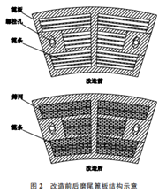 上述解決出料篦板堵塞的措施只能起到緩解出料篦板的堵塞、延長出料篦板的清理周期的作用,不能從根本上徹底解決問題。因此,還需對球磨機出料篦板的結構進行改造。通過利用現(xiàn)有材料自制防堵塞篦板,降低堵塞影響,增大磨尾通風面積,解決飽磨問題。改造前后磨尾篦板結構示意見圖2。